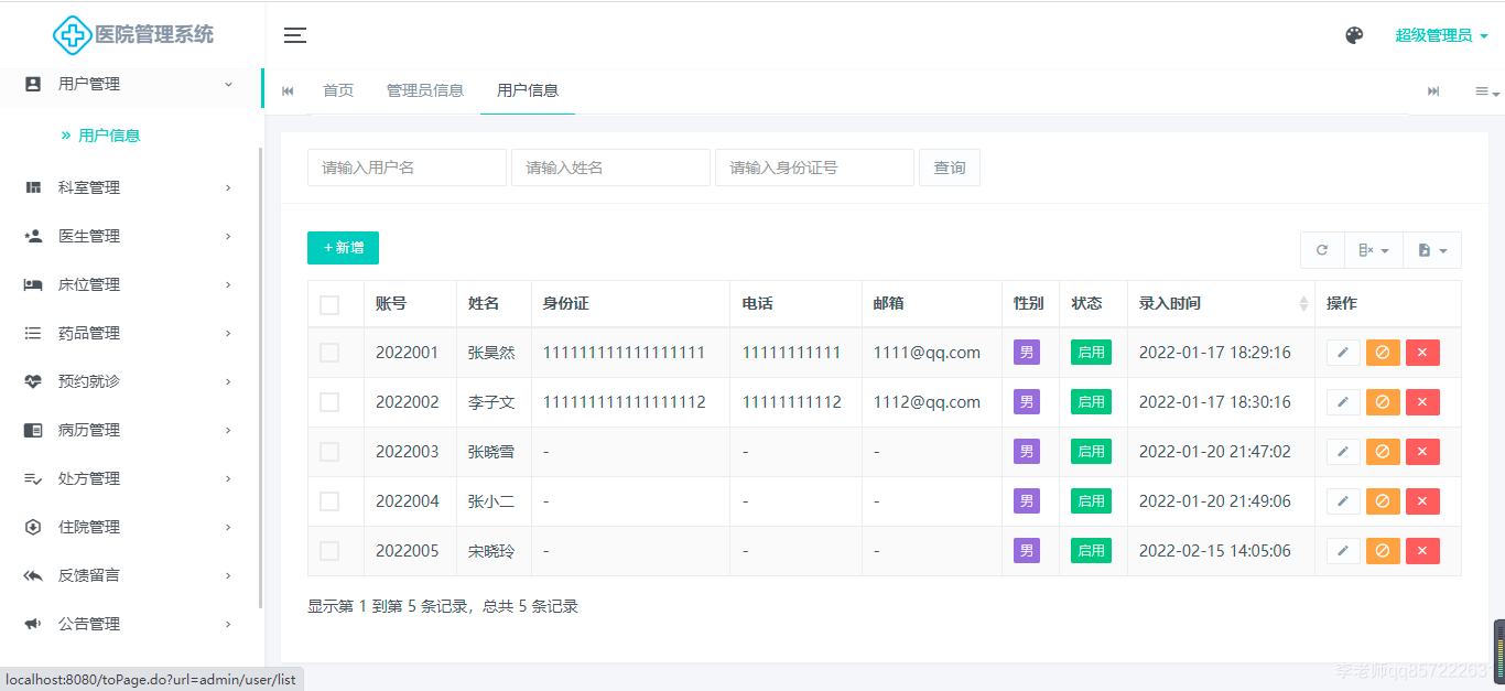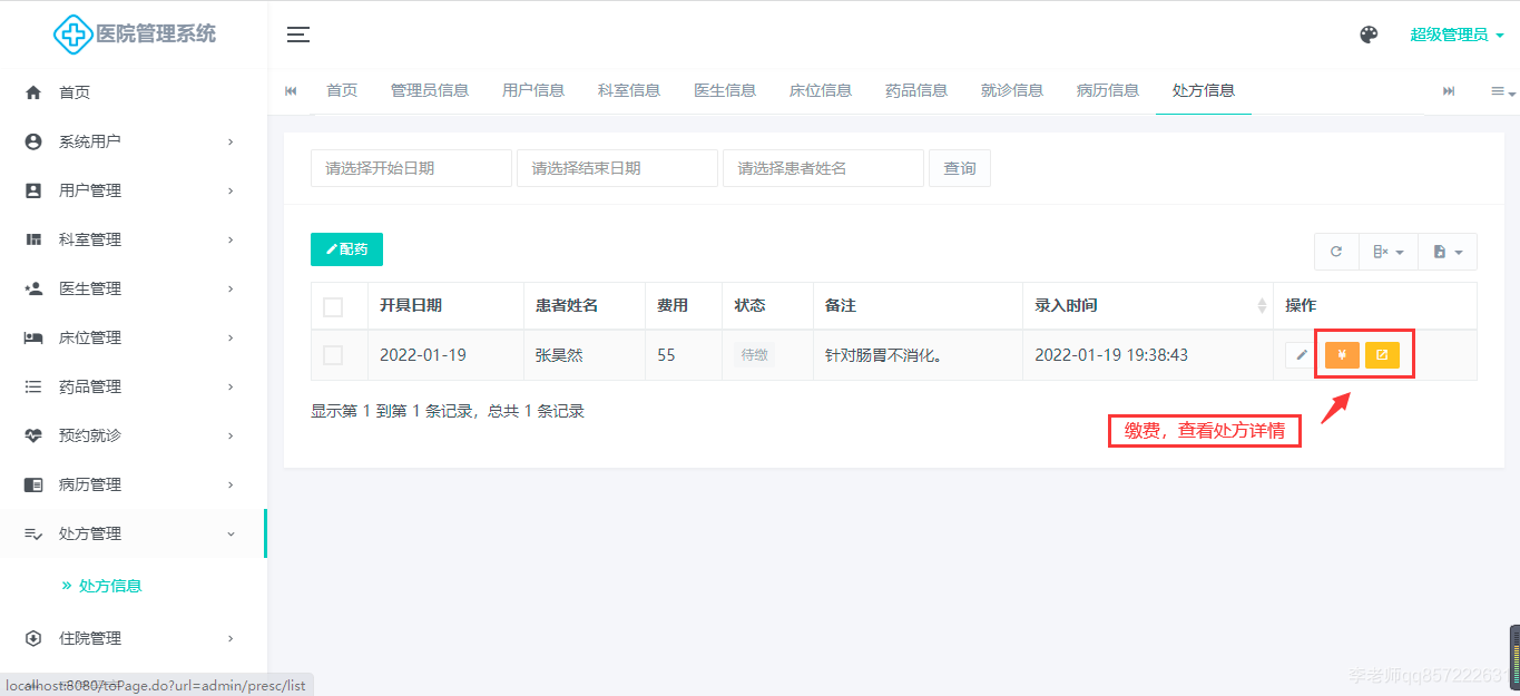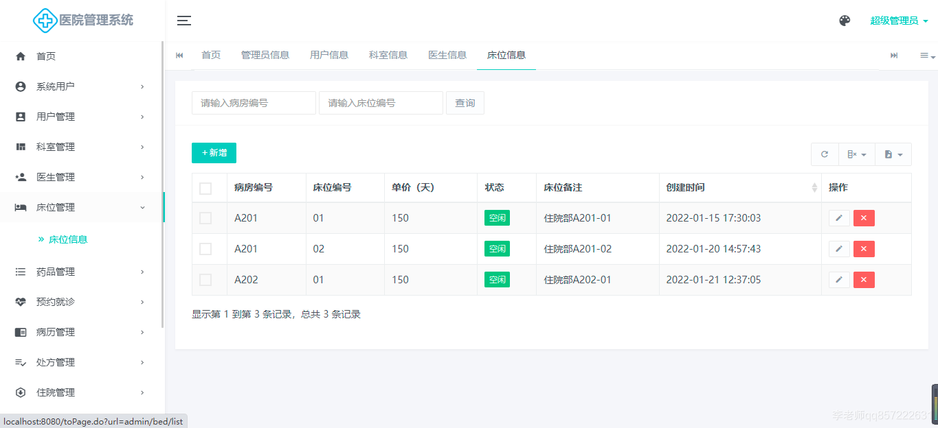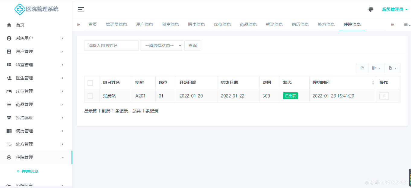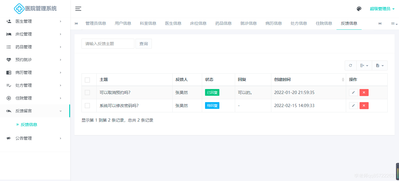超级管理员:管理员管理;用户管理;科室管理;床位管理;药品管理;预约就诊;病历管理;处方管理;住院管理;反馈留言;公告管理;个人信息修改;密码修改。