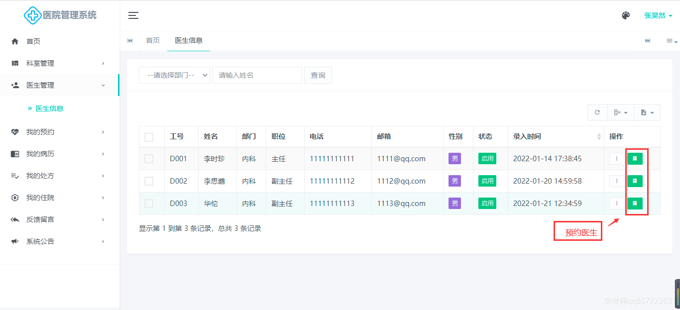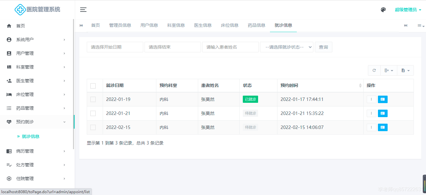 使用java+springboot+mysql开发的医院预约挂号管理系统,系统包含超级管理员、管理员、医生、患者角色,功能如下: