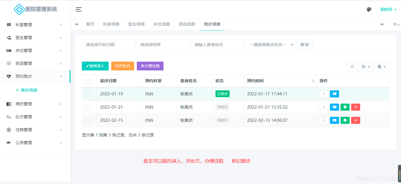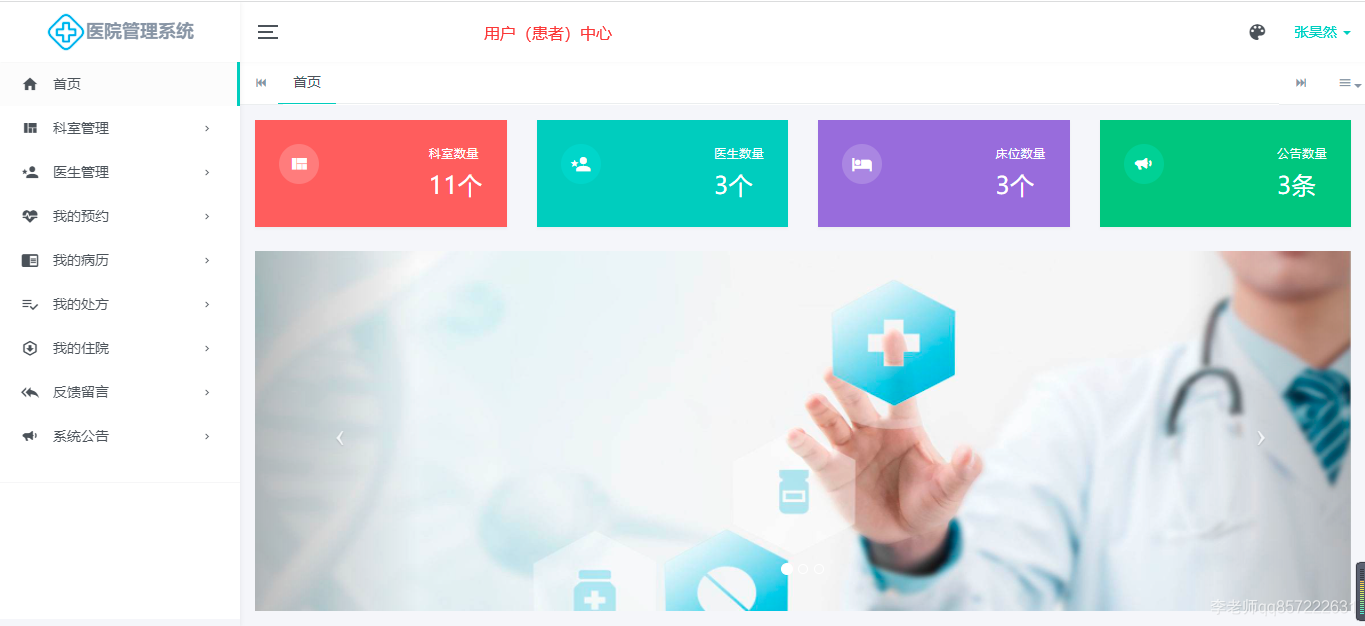 用户:注册、登录;科室查看;医生查看(预约);我的预约;我的病历;我的处方;我的住院;反馈留言;系统公告;
