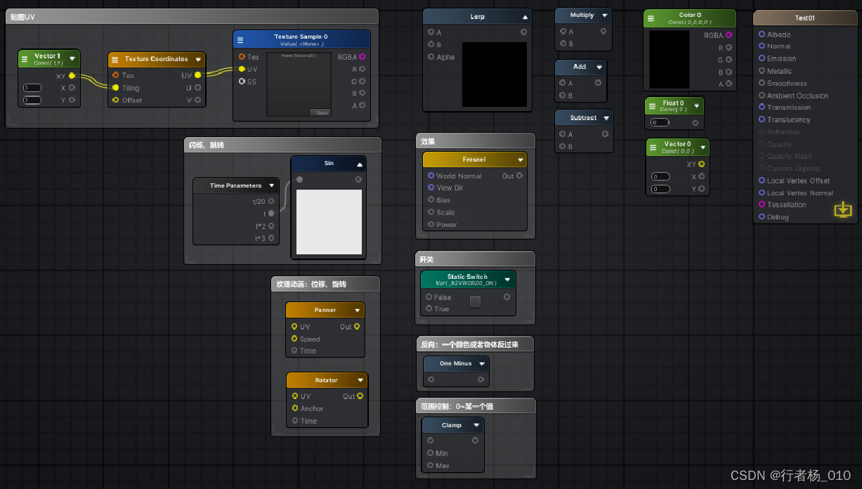 笔记: 1,颜色,贴图 2,加减乘除 3,菲涅尔、sin,float、vector、time 4,漫反射,法线,自发光,金属度,反射,AO明暗,折射,半透明度,顶点偏移。