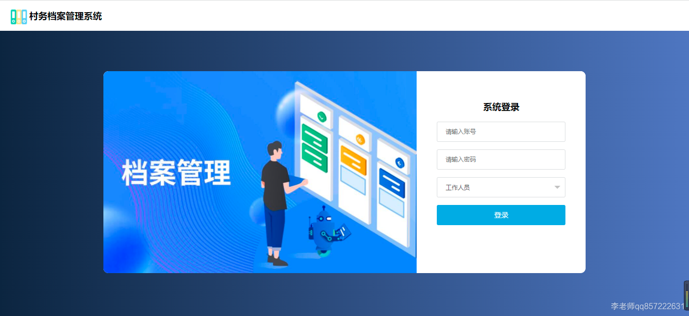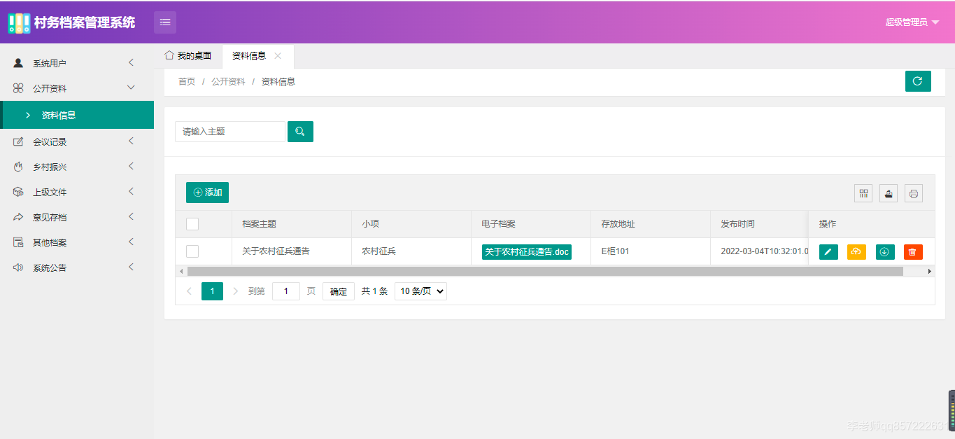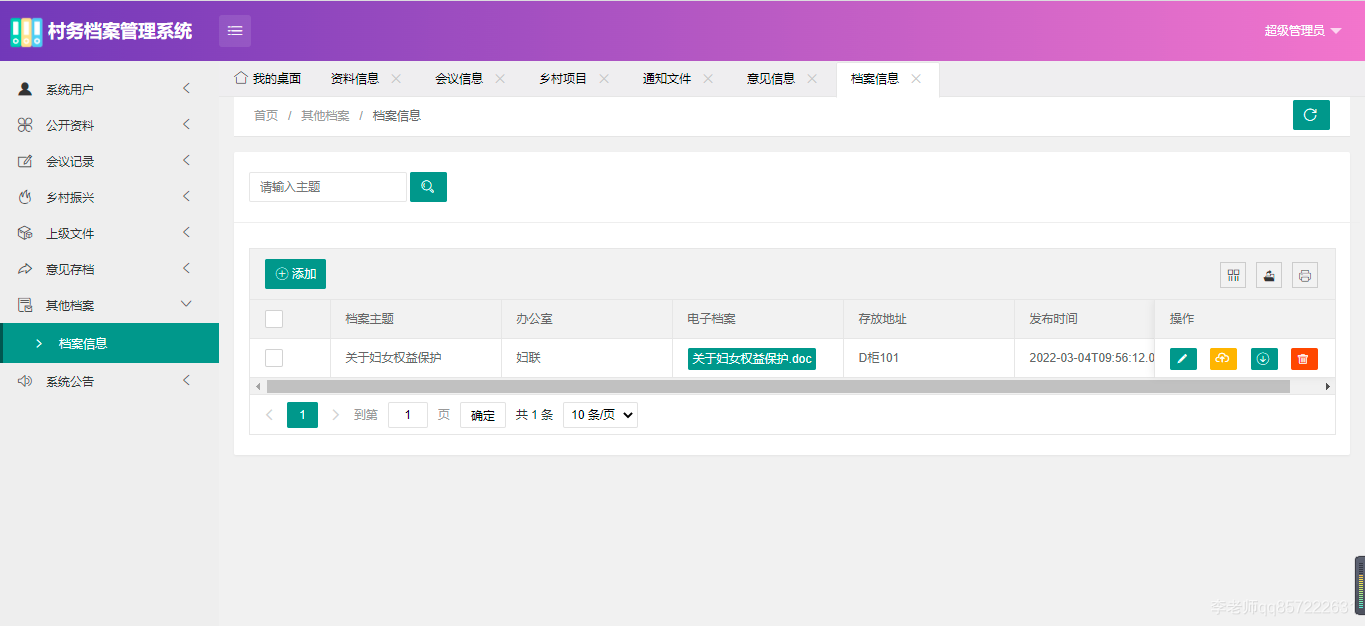 使用java+springboot+mysql开发的村务档案管理系统,系统包含超级管理员、工作人员角色,功能如下: