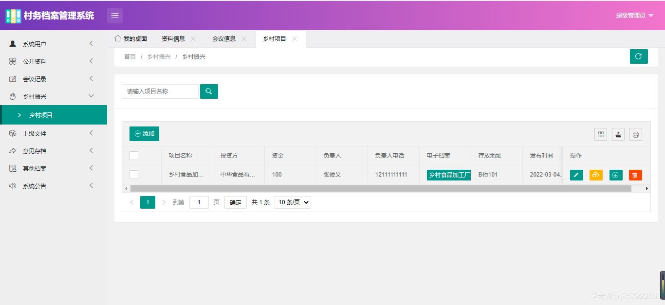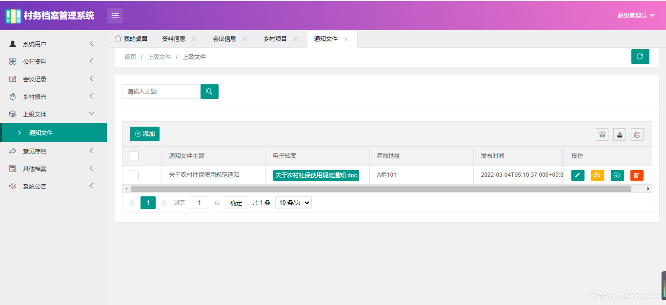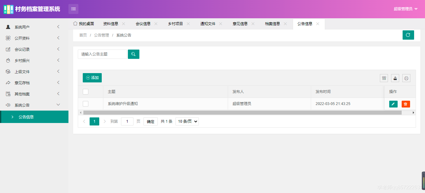 超级管理员:系统用户管理(工作人员管理);公开资料;会议记录;乡村振兴项目;上级文件;意见存档;其他档案;系统公告;个人信息、密码修改