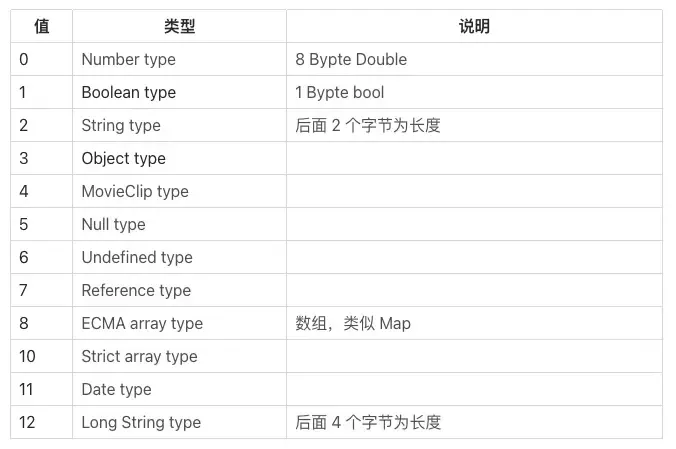 第 1 个字节表示 AMF 包类型,一般总是 0x08,表示数组。 第 2-5 个字节为 UI32 类型值,表示数组元素的个数。 后面即为各数组元素的封装,数组元素为元素名称和值组成的对。表示方法如下: 第 1-2 个字节表示元素名称的长度,假设为 L。后面跟着为长度为 L 的字符串。第 L+3 个字节表示元素值的类型。后面跟着为对应值,占用字节数取决于值的类型。