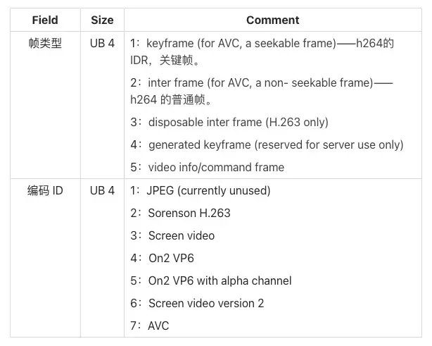 第一个字节包含视频信息:前4位表示帧类型;后4位表示编码类型。