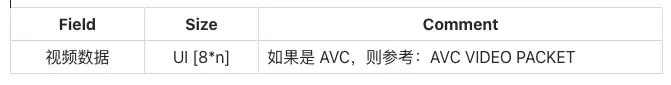 视频的格式(CodecID)是 AVC(H.264)的话,VideoTagHeader 会多出 4 个字节的信息,AVCPacketType 和 CompositionTime,所以是 H264 编码的情况下 VideoHeader 长度是 5 个字节。 AVC VIDEO PACKET 结构如下: