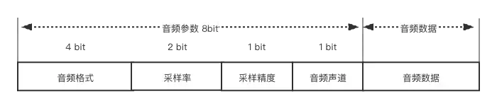 第一个字节包含音频信息:前 4bit 表示音频格式;第 5、6bit 表示采样率;第 7bit 表示采样精度;第 8bit 表示音频声道。