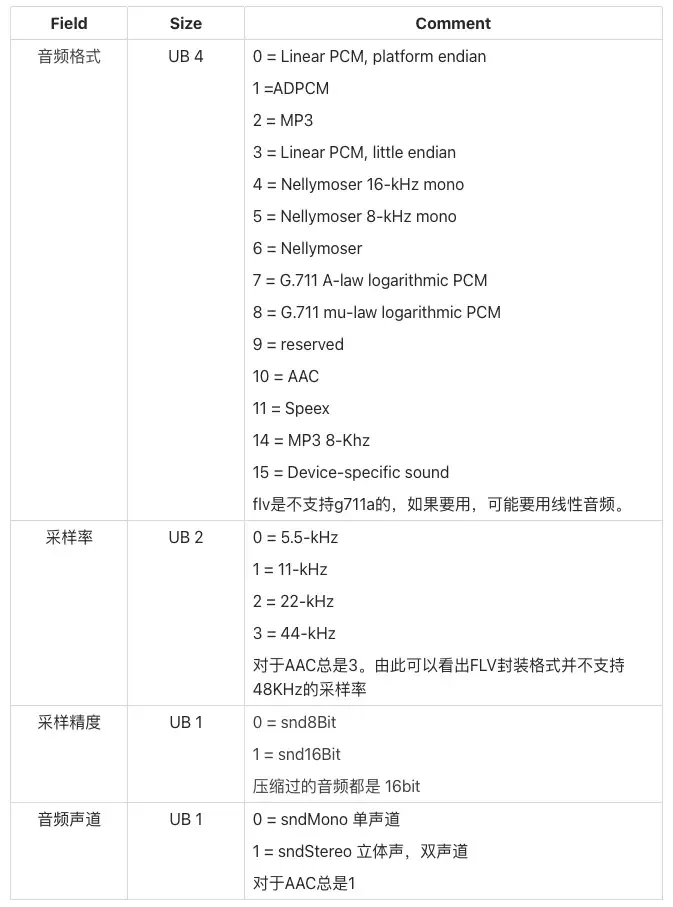 音频 Tag Data 区域开始的第一个字节包含了音频数据的参数信息,从第二个字节开始为音频流数据。结构如下: