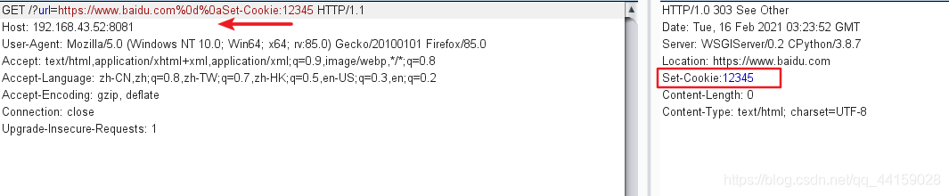 执行python crlf.py,访问192.168.60.7:8081/?url=https://www.baidu.com,在请求中拼接%0d%0aSet-Cookie:123,返回包中存在Set-Cookie字段
