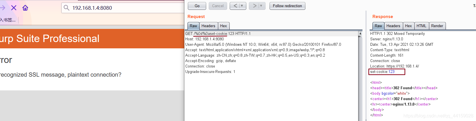 我们就可以通过添加一个crlf来提前结束响应头。如?url=https://www.baidu.com%0d%0aSet-Cookie:12345,浏览器识别到其中存在一个CRLF,就会把其后面的数据当做响应头来处理,提前结束响应头