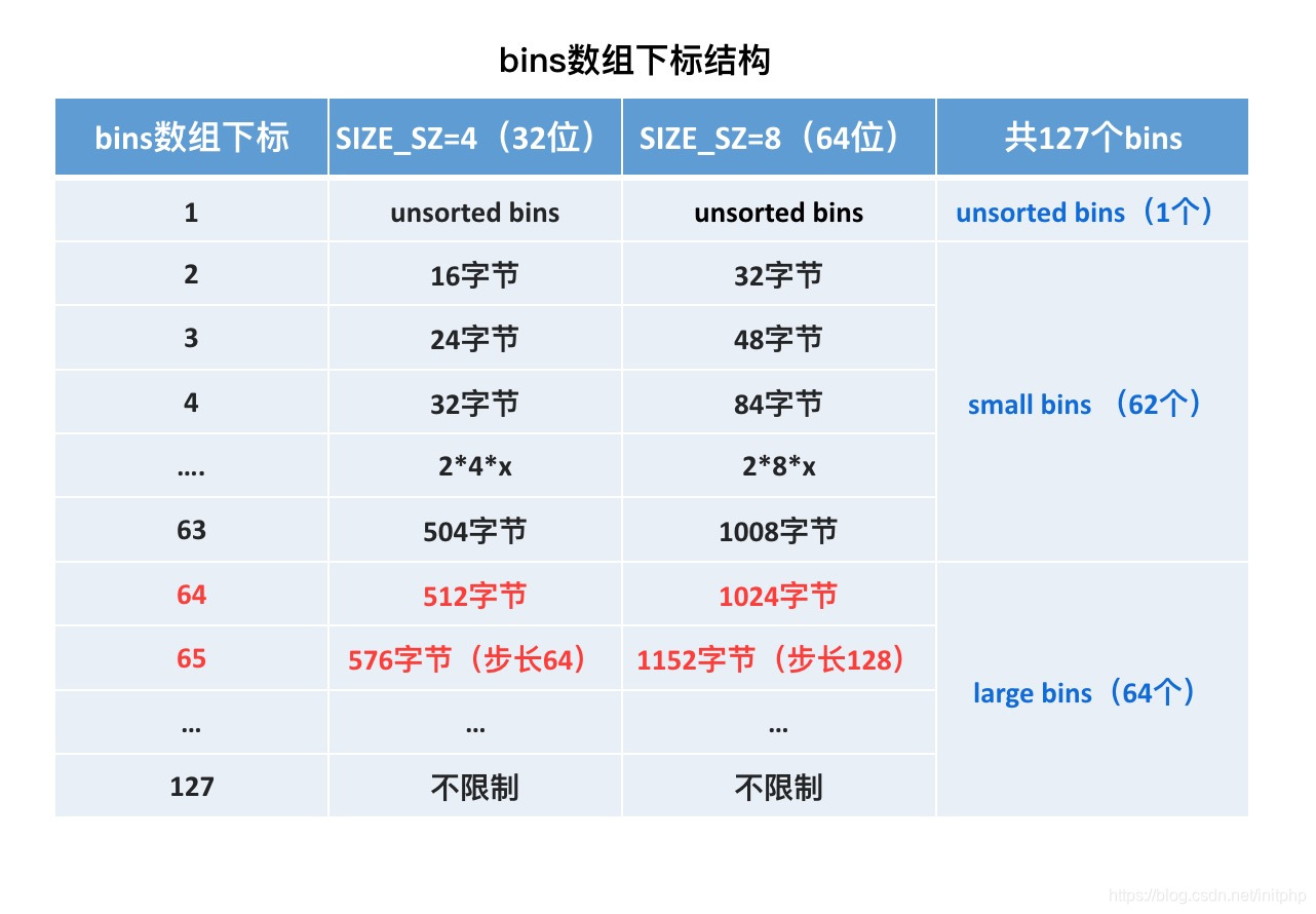 bins:主要管理small bins、large bins、unstored bins,在一个数组上,通过数组下标和步长方式来区分不同类型的bins