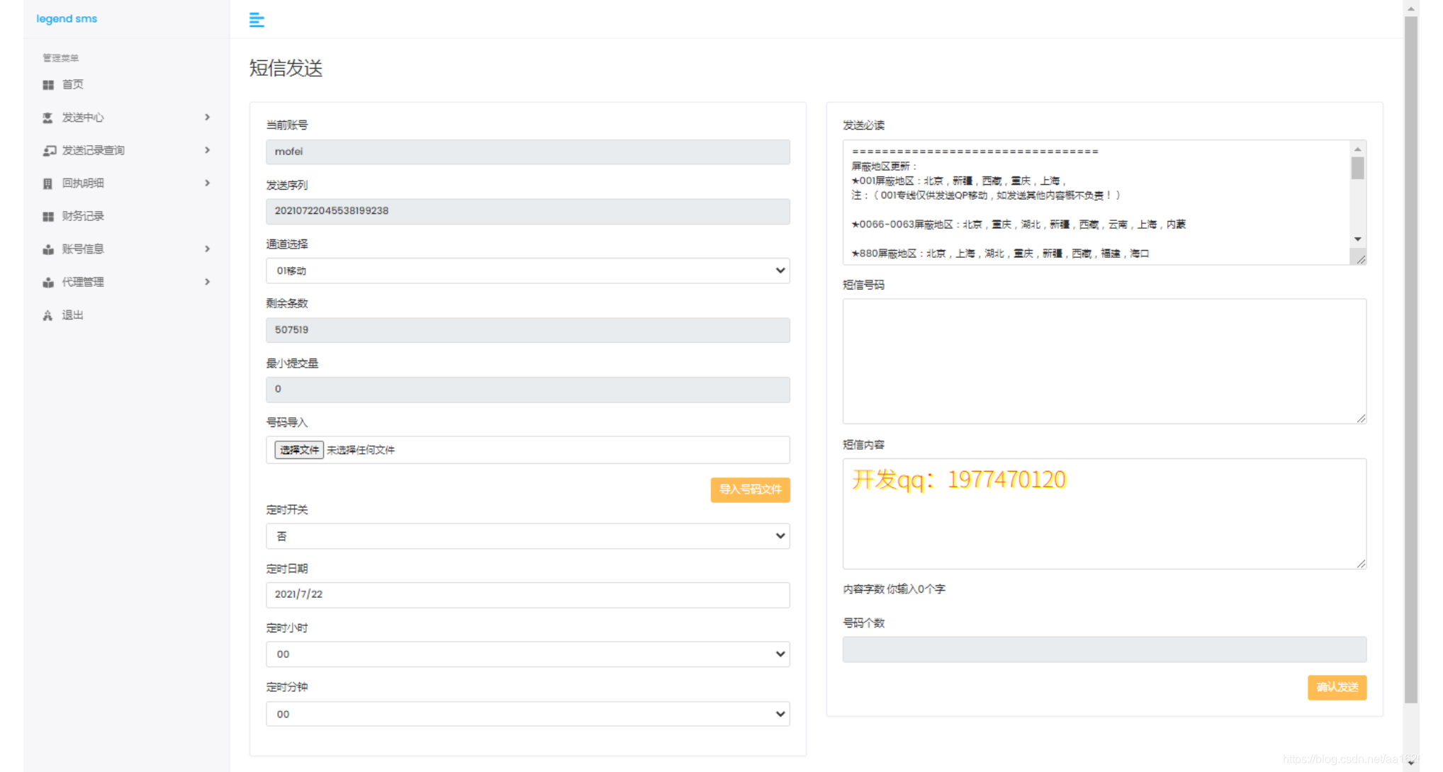 例如给某个客户分配两个通道 A通道和B通道 然后点击用户管理中的充值 给这个客户两个不同的通道进行充值 例如给A通道充值1000条 B通道充值2000条 qq1977470120