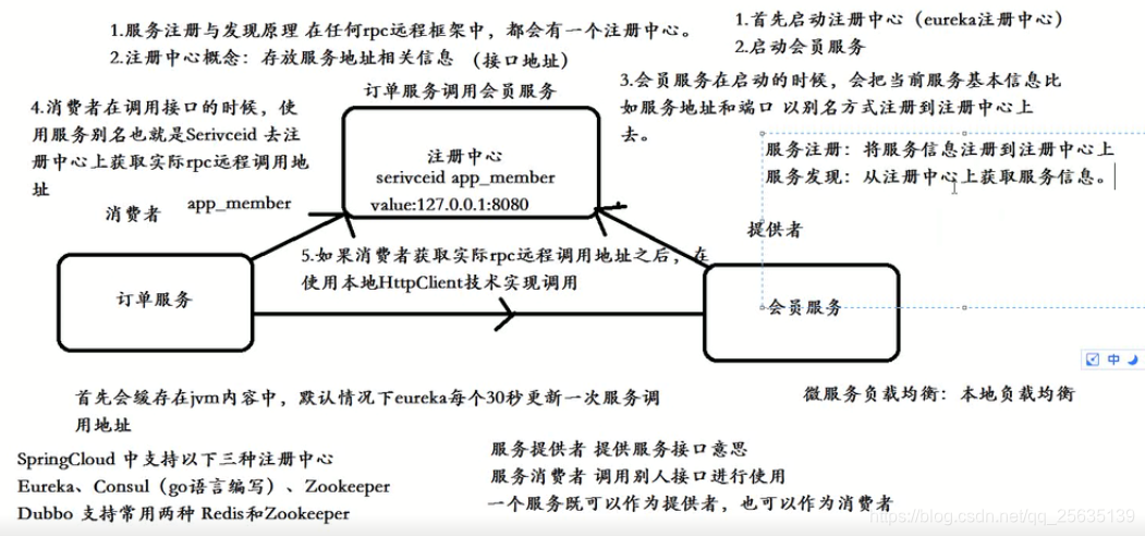 在服务注册与发现中,有一个注册中心,当服务器启动的时候,会把当前自已服务器的信息 比如 服务地址通讯地址等以别名方式注册到注册中心上。另一方(消费者|服务提供者),以该别名的方式去注册中心上获取到实际的服务通讯地址,然后在实现本地rpc调用远程。