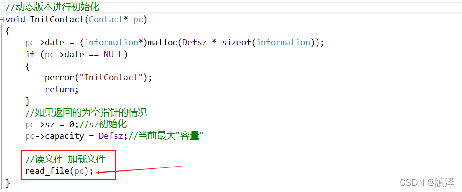 void read_file(Contact* pc) { FILE* pf = fopen("information.txt", "r"); //返回值判断 if (pf == NULL) { perror("read_file"); return; } //读文件 information tmp = {0};//问题:读文件停止(不知道你写入几个信息)?返回值的问题实际count while (fread(&tmp, sizeof(information), 1, pf))//读不到返回0 { //是否增容 Cap_inc(pc); //存放增容元素 pc->date[pc->sz] = tmp; //加载信息 pc->sz++; } //关闭文件 fclose(pf); pf = NULL; }