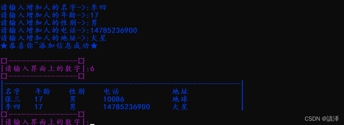 /* @Note1:当通讯录退出的时候,把信息写道文件。 @Note2:当通讯录初始化的时候,加载文件的信息。 */ #define _CRT_SECURE_NO_WARNINGS 1 #include"a.h" #include<Windows.h> #pragma warning(disable:6031) //颜色函数 void color(short x) { if (x >= 0 && x <= 15) SetConsoleTextAttribute(GetStdHandle(STD_OUTPUT_HANDLE), x); else SetConsoleTextAttribute(GetStdHandle(STD_OUTPUT_HANDLE), 7); } //创建菜单函数 void menu() { color(0);//黑色 system("cls");//清屏 color(12);//白色 printf("¤--------------------------------------------¤\n"); printf("|■■■■■■■■→通讯录v1.0←■■■■■■■■|\n"); printf("|———————————————————————|\n"); printf("|★★★★★→1.increase ■ 2.deLete←★★★★★|\n"); printf("|★★★★★→3.find ■ 4.Revise←★★★★★|\n"); printf("|★★★★★→5.Check ■ 6.Print ←★★★★★|\n"); printf("|★★★★★→0.Exit ■ ←★★★★★|\n"); printf("|———————————————————————|\n"); printf("|■■■■■■■■→通讯录v1.0←■■■■■■■■|\n"); printf("¤--------------------------------------------¤\n"); } enum Number { Exit, Increase, DeLete, Find, Revise, Check, Print, }; int main(void) { menu(); int input = 0; //当然初始化全0:Contact con = {0};也是可以的,当然我们这里的初始化不是这样的原因是可以应对比较复杂的问题。 Contact con;//初始化通讯录 //给date申请一块连续的内存空间存放在堆区上。 InitContact(&con); do { color(5); printf("¤----------------¤\n"); printf("|请输入界面上的数字|:"); scanf("%d", &input); printf("¤----------------¤\n"); color(1); switch (input) { case Exit: //销毁之前先保存。 Save_Contact(&con); //把通讯录里面的内存空间date给释放掉。 Destory_Contact(&con);//销毁通讯录。 printf("══════════════@\n"); printf("退出通讯录v1.0@\n"); printf("══════════════@\n"); break; case Increase: //增加人的信息,放在通讯录当中去。 Add_Contact(&con); break; case DeLete: //删除通讯人的信息 DeLete_Contact(&con); break; case Find: //查找指定通讯录人的信息 Find_Contact(&con); break; case Revise: //修改指定通讯录人的信息 Revise_Contact(&con); break; case Check: //排查通讯录当中人员的信息 Check_Contact(&con); break; case Print: //打印通讯录当中人员的信息。 Print_Contact(&con); break; default:printf("你输入的数字找不到,请重新输入~\n"); } } while (input); return 0; }