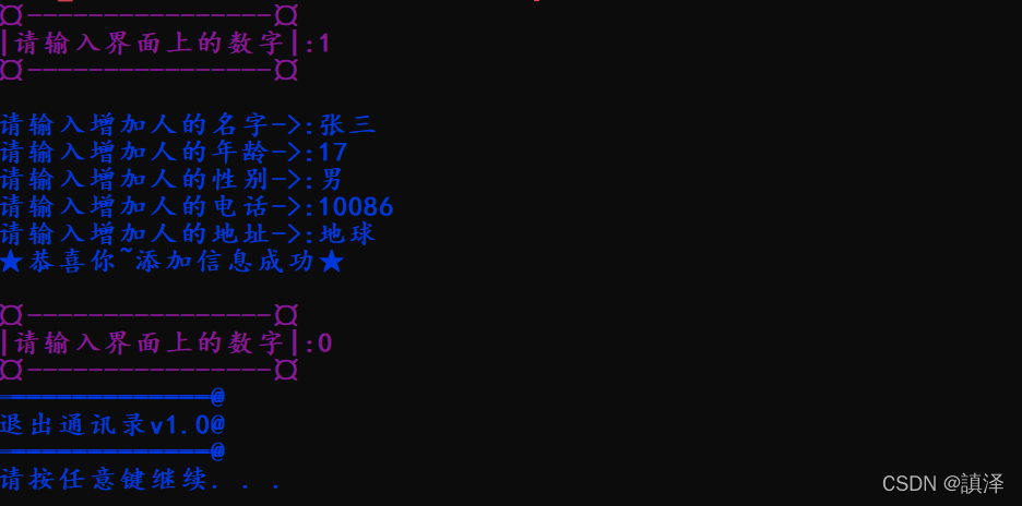 那么这个就已经实现了通讯录的最终版本了,这个项目适合已经把C语言学完的人做。巩固自己以往的能力,做个这个提升自己逻辑思维和代码能力的一个小的项目。